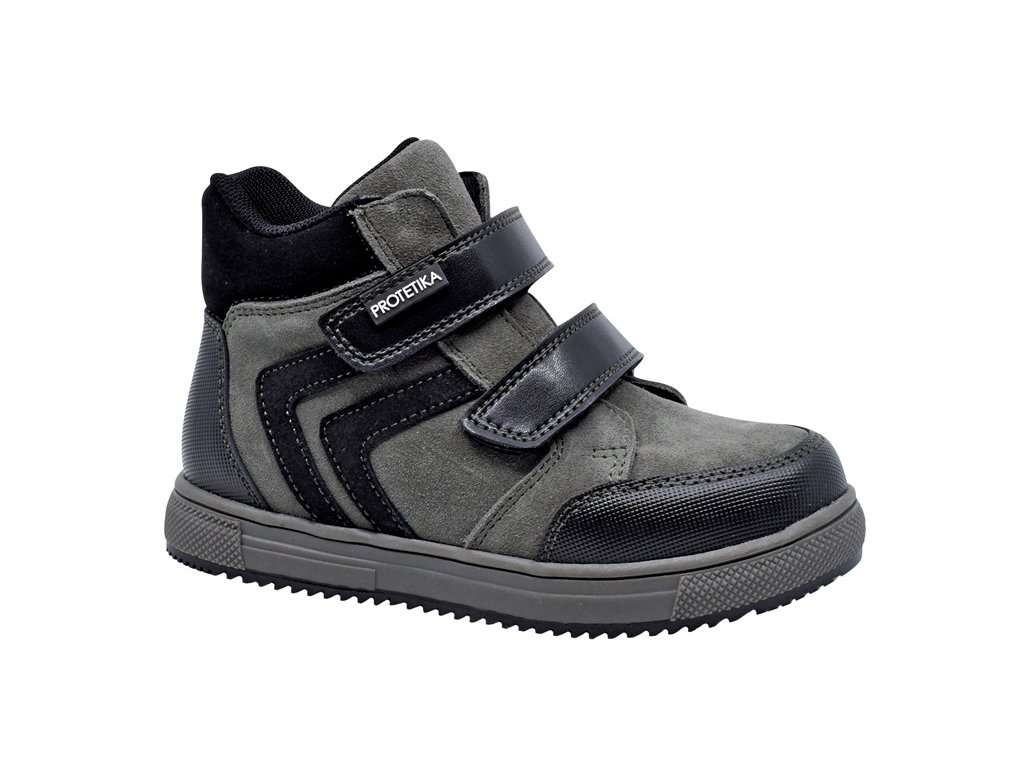Chlapčenské vyššie celoročné topánky od Protetiky. Podrážka je pevnejšia a je jemne vyvýšená po celom obvode topánok. V prednej časti a aj v zadnej na okope sa nachádza pogumovaná koža. Zvršok je z usňovej kože. Stielka je vyberateľná, kožená a má prvok na podporu prirodzeného vývoja klenby. Zapínanie je na dva suché zipsy. Pracky sú z hladkej ko že s 3D potlačou.Material