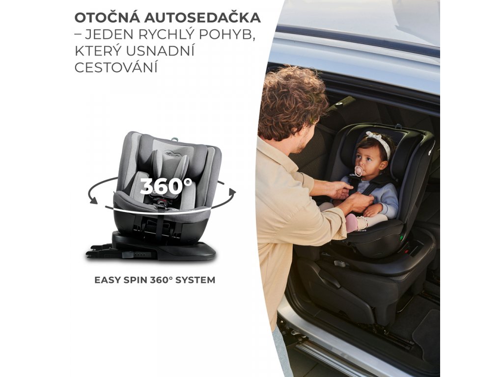 Systém EASY SPIN 360° umožňuje rýchle a jednoduché otočenie autosedačky smerom k dverám. Vďaka tomu v nej môžete pohodlnejšie usadiť svoje dieťa a zabezpečiť ho pomocou 5-bodových vnútorných bezpečnostných pásov. Môžete tiež rýchlo zmeniť RWF na FWF bez toho, aby ste museli celú autosedačku v aute vybrať a znovu upevniť.