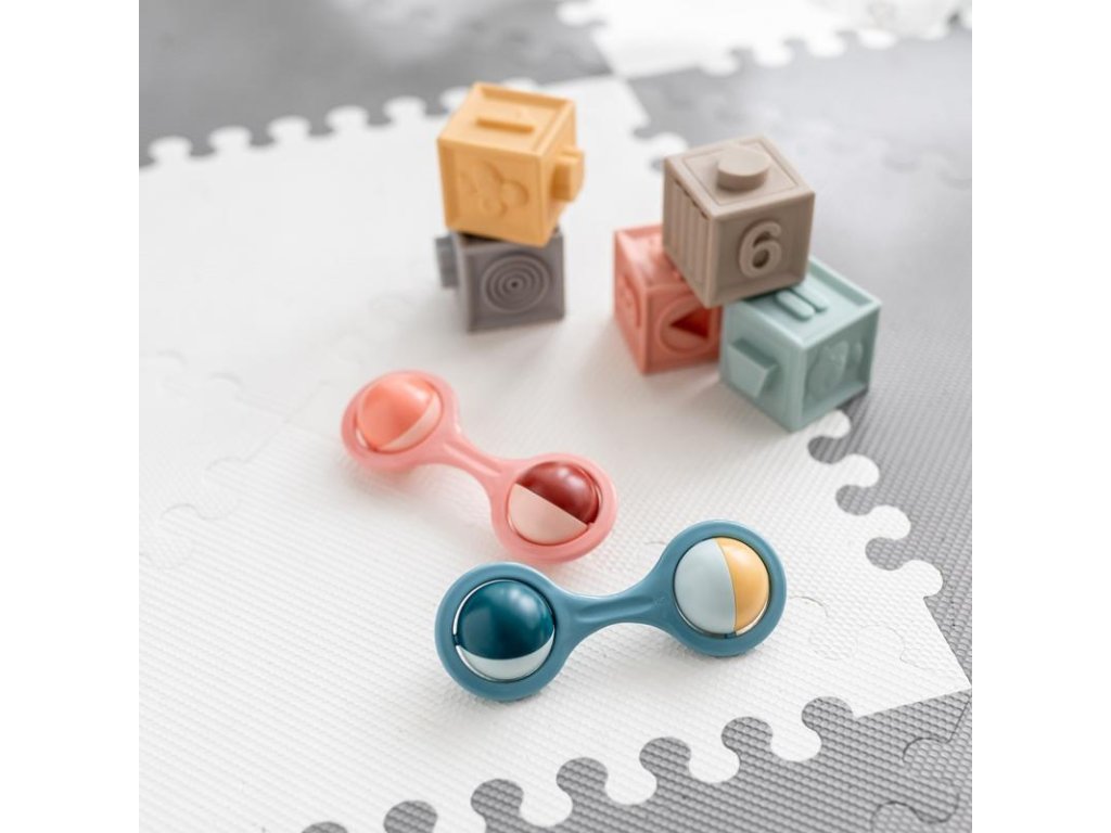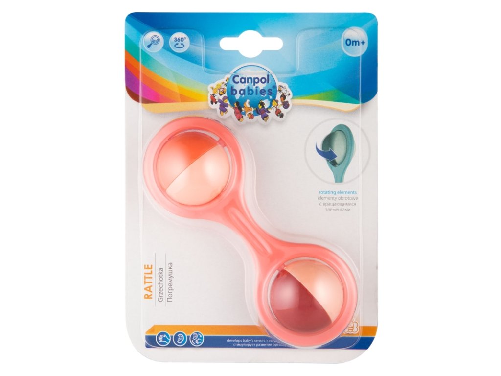 Hrkálka v tvare činky s rotujúcimi prvkami je ideálna ako prvá hračka pre najmenšie deti. Je ľahučká a praktická, pohodlne sa drží v malých detských ručičkách. Jeho pohyblivé prvky, ktoré sa otáčajú a vytvárajú príjemný chrastivý zvuk, ihneď zaujmú každé batoľa. Kontrastné farby vzbudzujú záujem u bábätka a rozvíjajú jeho zrak. Hračka je určená pre deti od 0 m a neobsahuje BPA.Vlastnosti: