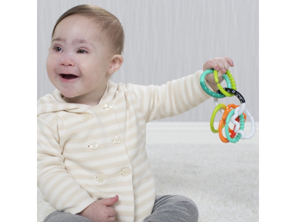 Ľahká a ľahko uchopiteľná hrkálka pre najmenších je tvorené z ôsmich navzájom prepojiteľných krúžkov, ktoré môžete rôznymi spôsobmi spájať aj používať samostatne. Každý krúžok ponúka inú textúru na skúmanie rukami aj ústami. Vhodné pre deti od narodenia.