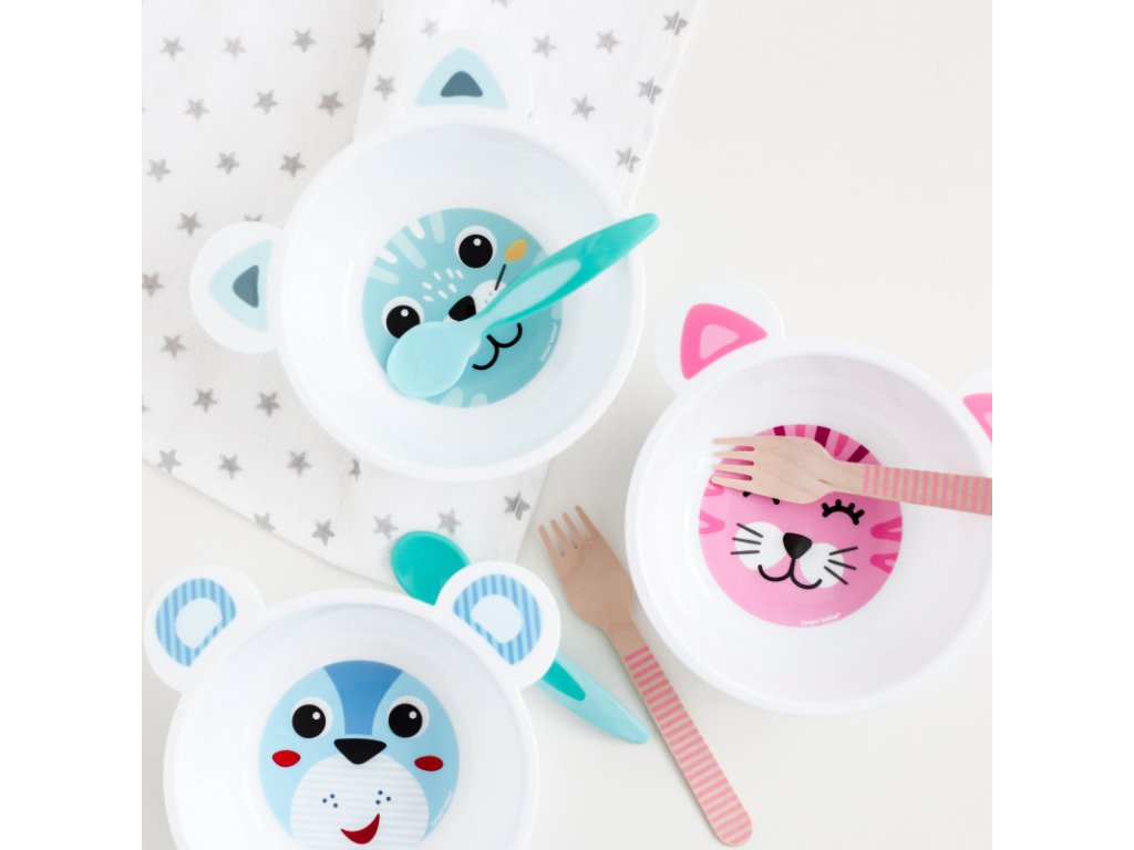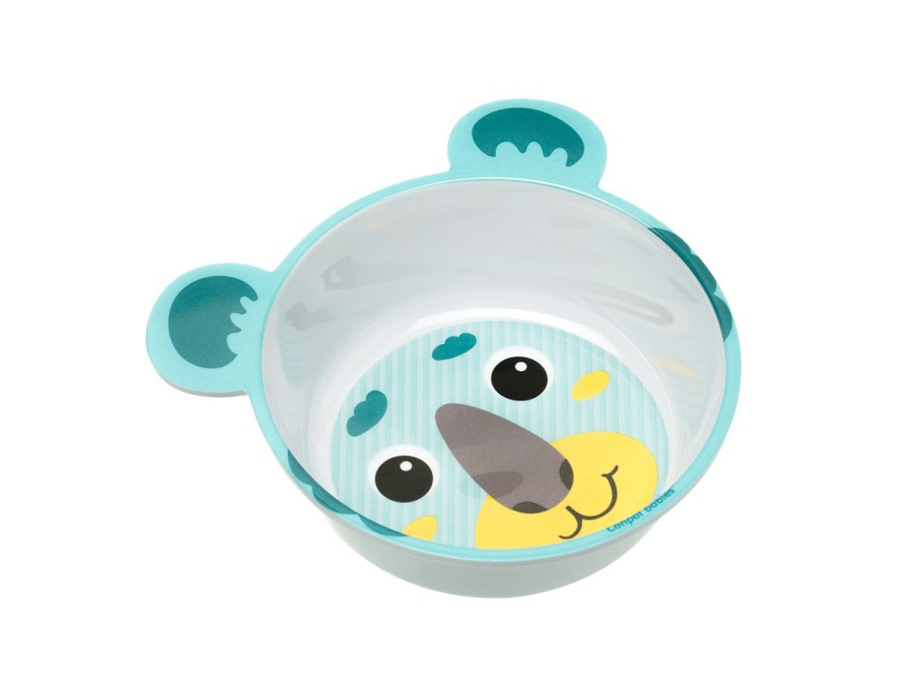 Farebná miska netypického tvaru je vyrobená z kvalitného melamínu so zatavenými farebnými motívmi (nedostávajú sa do kontaktu s jedlom). Protišmykové dno zabraňuje kĺzaniu misky po doske stola. Úchyty uľahčujú jej pridržiavanie alebo prenášanie.