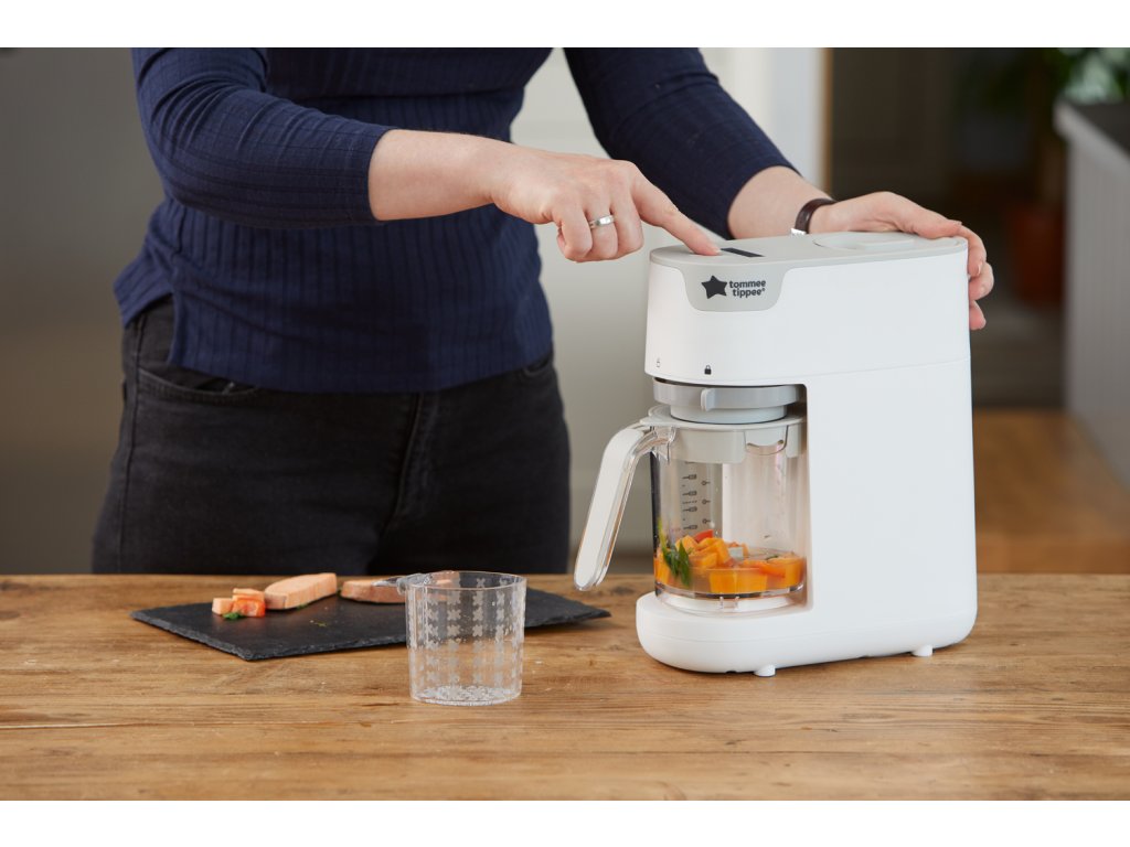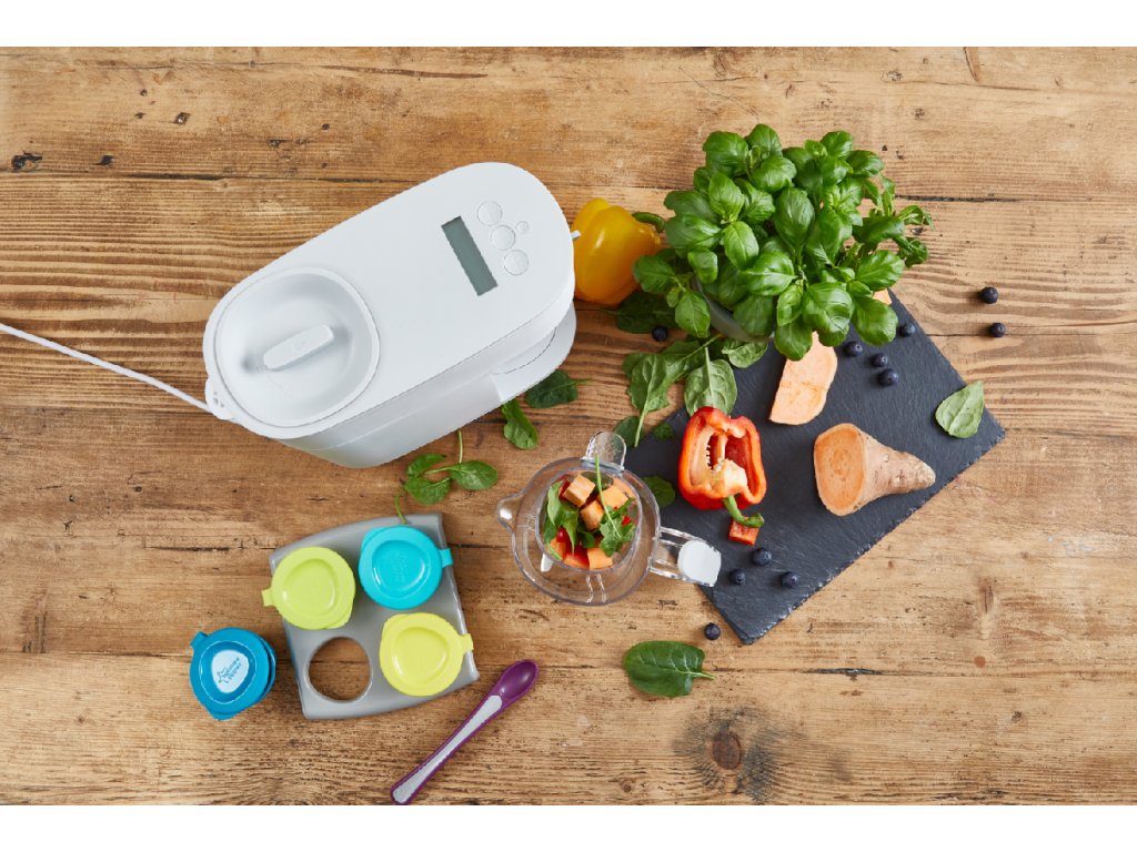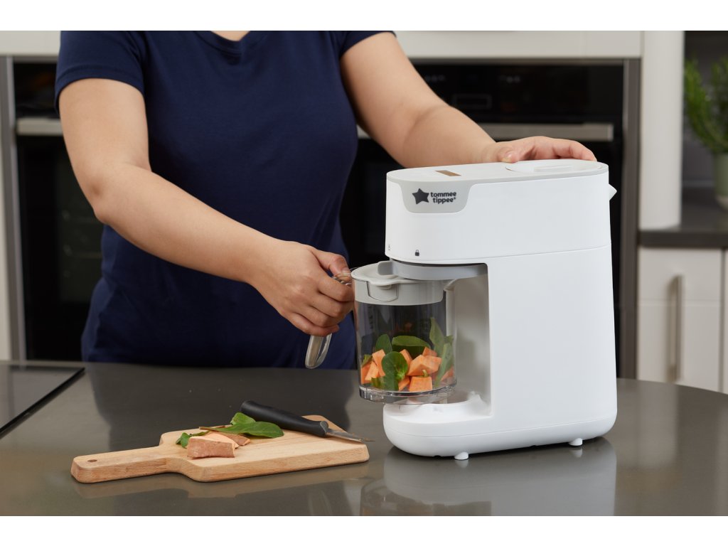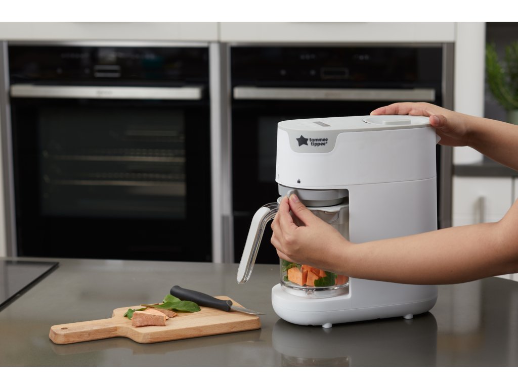 Parný hrniec a mixér v jednom umožňuje zdravo uvariť pokrm v pare a následne ho v rovnakej nádobe rozmixovať. Príprava jedla je veľmi jednoduchá - iba do zásobníka nalejete vodu, do košíka v priehľadnej nádobe vložíte na kúsky nakrájané suroviny (zeleninu, ovocie, mäso atď.) a na digitálnom displeji nastavíte dobu varenia. Po skončení nastavenej doby varenia sa prístroj sám vypne a ozve sa zvukový signál. Prístroj umožňuje nasledujúce tri varianty nastavenia: doba varenia + doba mixovania - po skončení varenia prístroj hotové suroviny automaticky rozmixuje doba varenia - po skončení varenia môžete hotové suroviny použiť nerozmixované alebo pokračovať nastavením doby mixovania doba mixovania - ak chcete suroviny iba rozmixovať bez predchádzajúceho cyklu varenia Funkcia pamäte posledného nastavenia umožňuje zopakovanie naprogramovaného cyklu pri použití prístroja do 30 minút od posledného použitia. Podľa veku dieťaťa môžete suroviny nastavením dĺžky mixovanie rozmixovať na jemnú hladkú kašu alebo na hrubšiu štruktúru s kúskami. Keď sa dieťa naučí dobre hrýzť, dá sa prístroj ďalej používať pre zdravé varenie v pare aj bez mixovania. Neobsahuje BPA.