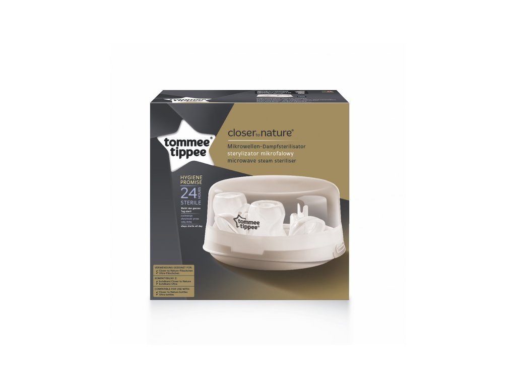 Ľahký, kompaktný sterilizátor Tommee Tippee Closer to Nature umožňuje jednoduchú a rýchlu sterilizáciu až 4 dojčenských fliaš a doplnkov počas cca 4-8 minút (podľa príkonu mikrovlnky). Obsah zatvoreného sterilizátora zostáva sterilný po dobu 24 hodín. Kompaktná veľkosť umožňuje jeho použitie aj na cestách. Navrhnutý špeciálne pre fľaše Tommee Tippee Closer to Nature. Balenie obsahuje: sterilizátor, silikónový cumlík Tommee Tippee Closer to Nature Anytime 0-6m a kliešte na cumlíky. Fľaštičky nie sú súčasťou výrobku. Neobsahuje bisfenol.