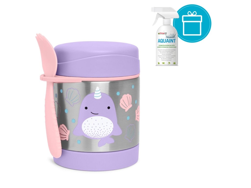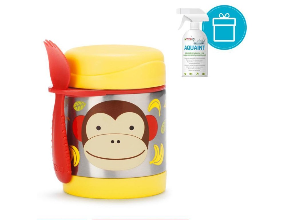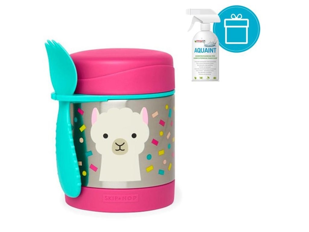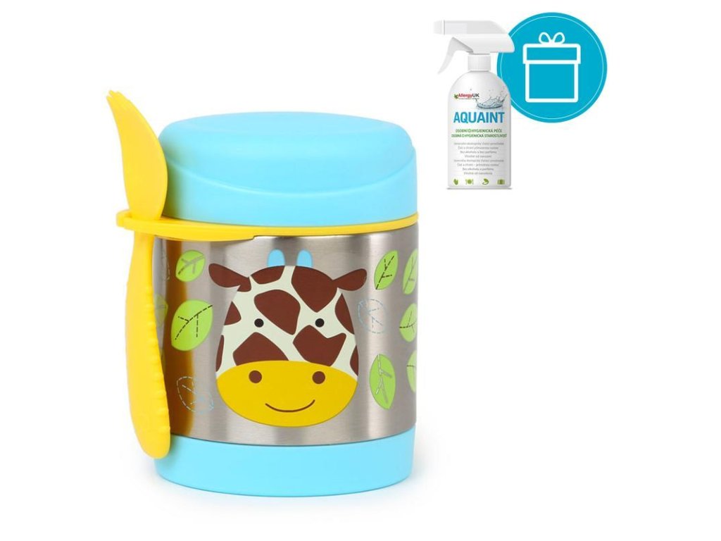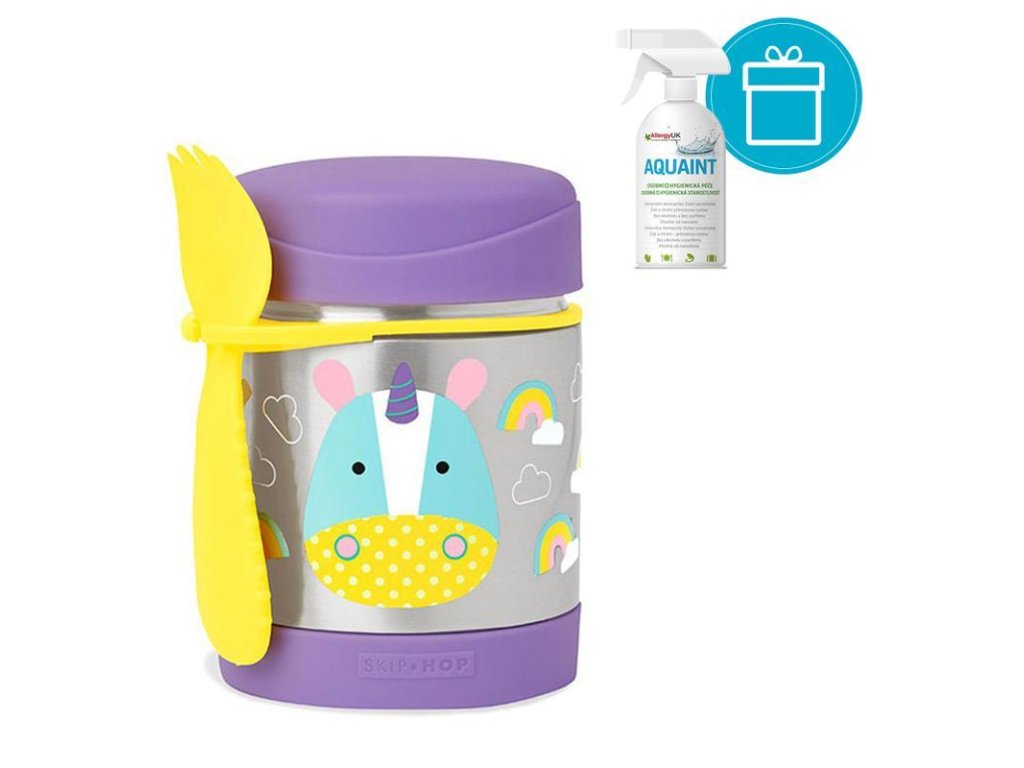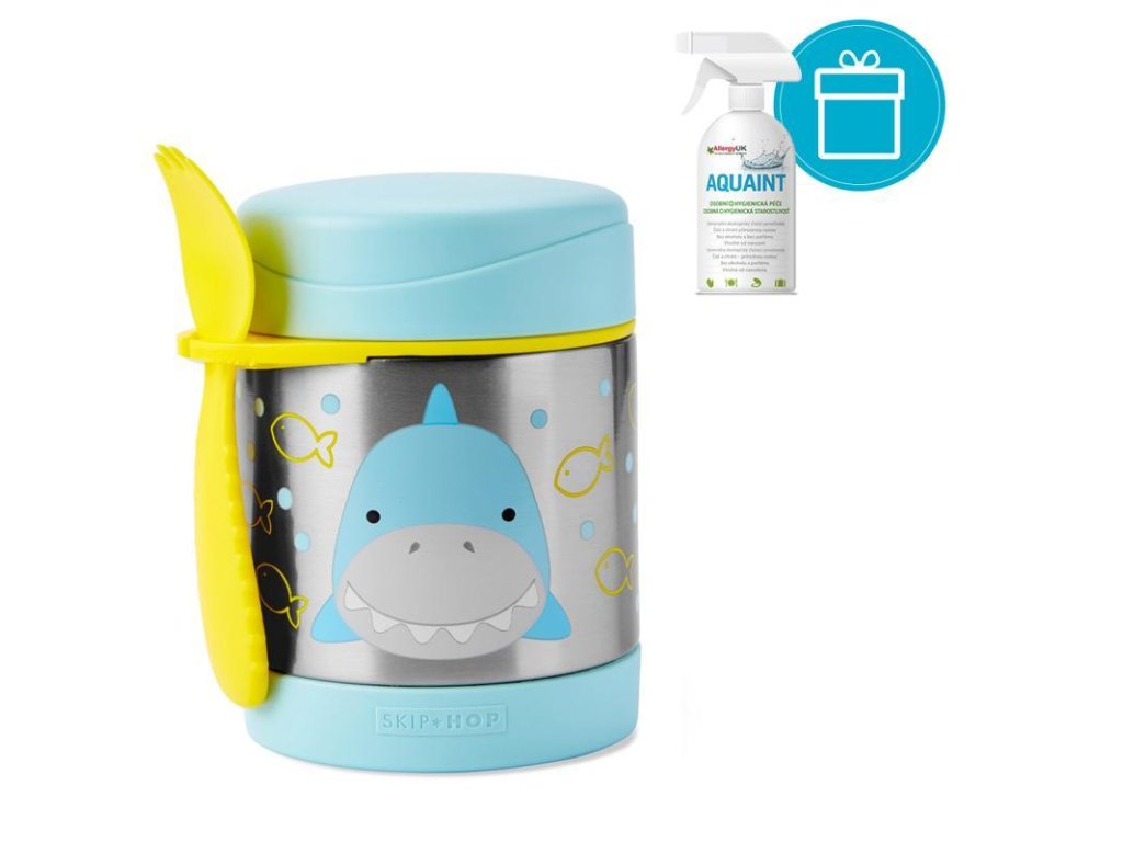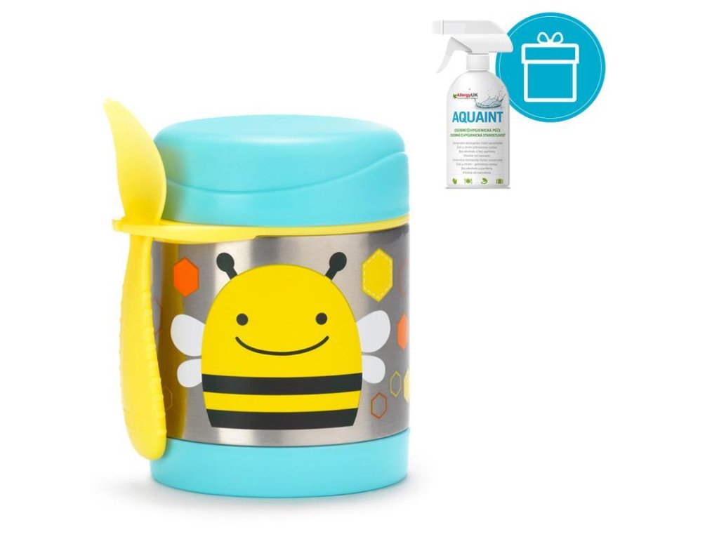 AQUAINT 100% ekologická čistiaca voda 500ml + SKIP HOP Zoo Termoska na jedlo s lyžičko/vidličkou Motýlik 325ml, 12m+SKIP HOP Táto krásna termoska z nerezovej ocele s potlačou udrží detskú porciu teplú či studenú. Súčasťou je praktická vidlička (lyžička + vidlička v jednom), ktorú možno zavesiť do držadla. Držiatko je možné využiť aj na uloženie iného detského príboru (podobného rozmeru). Termoska uchová pripravený pokrm: teplý až po dobu 7 hodín / a studený až po dobu 5 hodín v závislosti na teplote pripravovaného pokrmu a na vonkajšej teplote. Pre lepší výsledok, pripravovaný pokrm predhrejte/ochlaďte v teplej/studenej vode po dobu 5 minút pred vložením do termosky.