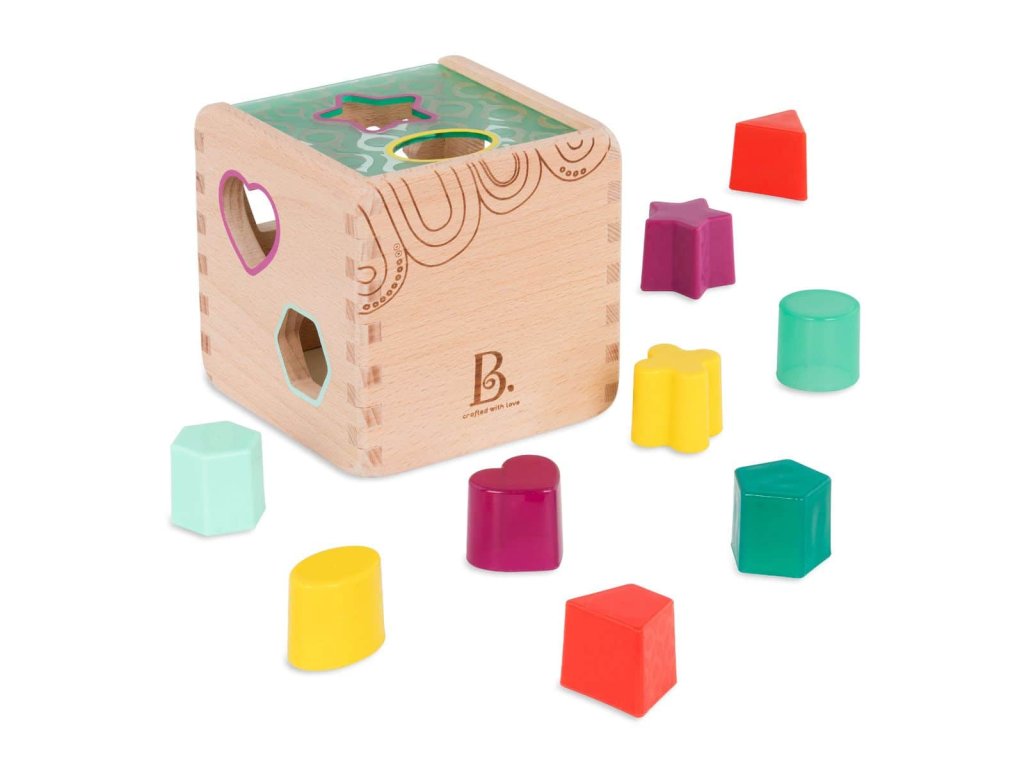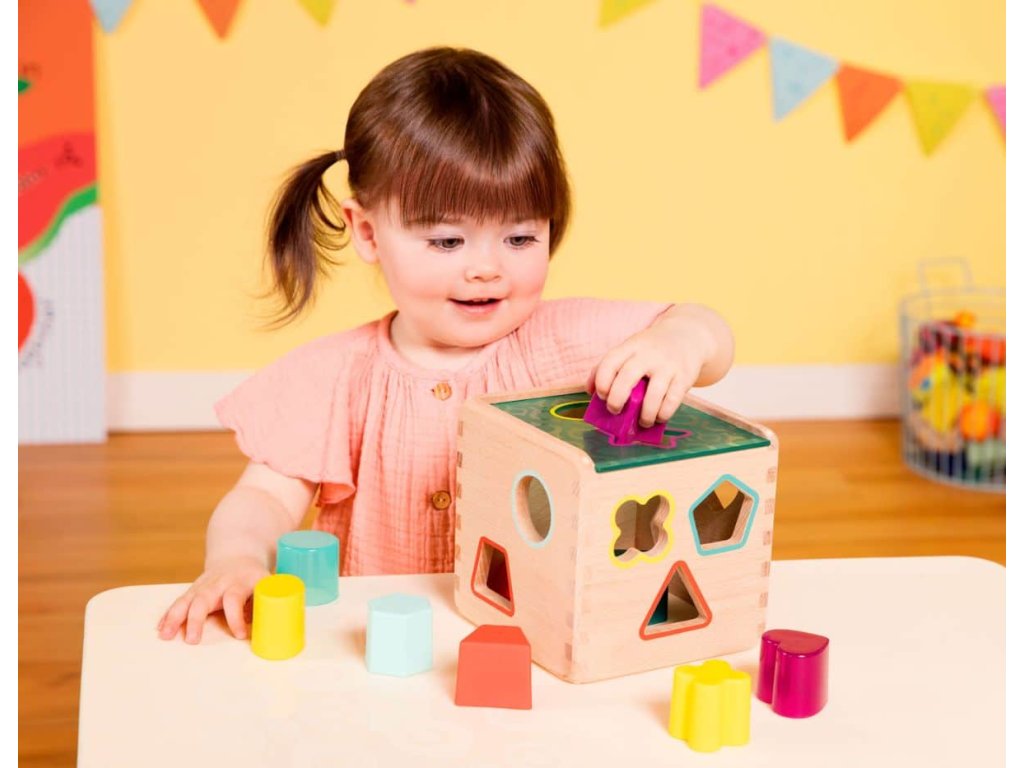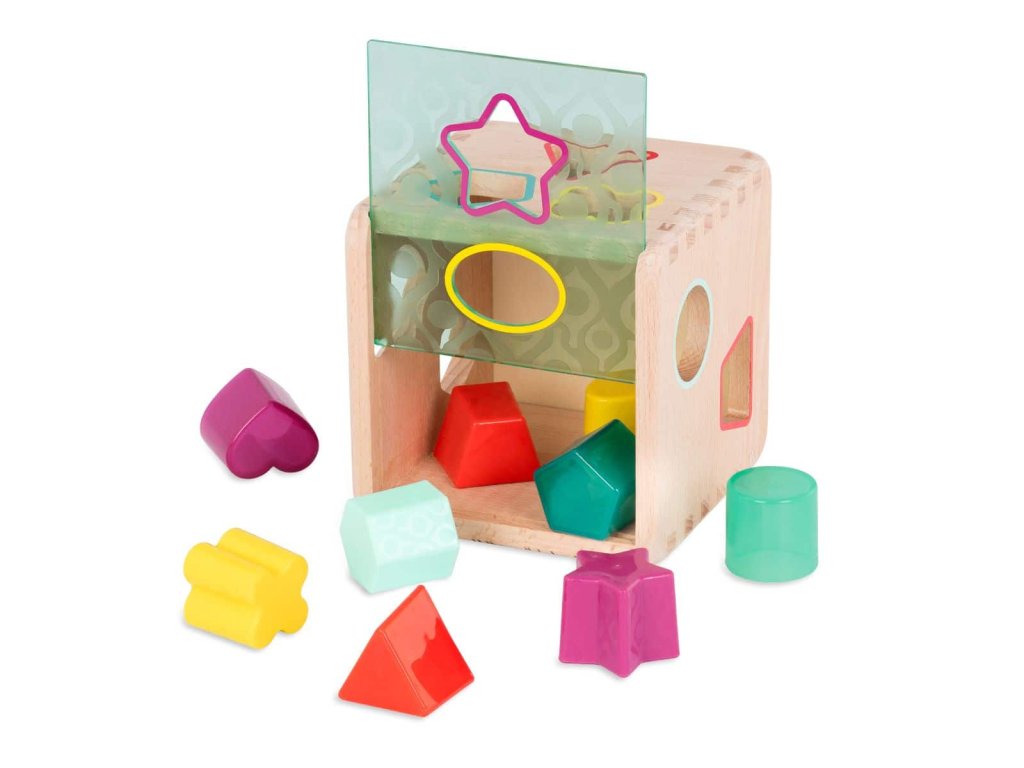 Drevená kocka s deviatimi rôznofarebnými vkladacími tvarmi, ktoré zodpovedajú otvorom v stenách kocky. Klasická hračka, s pomocou ktorej sa dieťa zábavnou formou učí rozpoznávať farby a tvary. Priehľadné posuvné veko umožňuje dieťaťu vidieť dovnútra kocky a zároveň uľahčuje upratovanie po skončení hry.